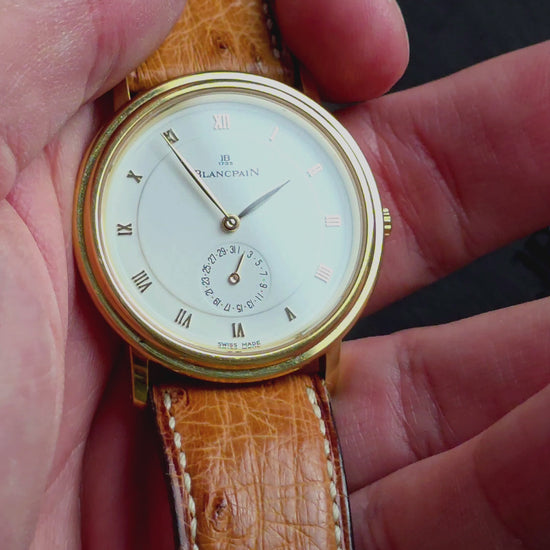 Il Villeret Ref. 4795 , presentato qui come set completo del 1991 , è un superbo esempio della maestria artigianale di quell'epoca. Realizzato in caldo oro giallo 18 carati , presenta armoniose proporzioni da 34 mm e un profilo sottile che si adatta con grazia al polso. Il quadrante bianco smalto pulito con numeri romani applicati emana un lusso discreto, mentre la complicazione del calendario (data) aggiunge un tocco di pratica eleganza. All'interno batte un movimento automatico caratterizzato dal suo rotore in oro 21 carati, visibile attraverso il fondello in zaffiro, un dettaglio distintivo della raffinata finitura di Blancpain. Il numero di serie 7xx colloca questo esemplare tra i primi esemplari di produzione della referenza, aggiungendo ulteriore fascino per i collezionisti. Completo di scatola, documenti e accessori originali , questo 4795 rappresenta non solo un segnatempo, ma un'istantanea della rinascita di Blancpain nell'età d'oro dell'orologeria meccanica: una scelta raffinata per coloro che apprezzano la bellezza intramontabile della vera purezza orologiera.