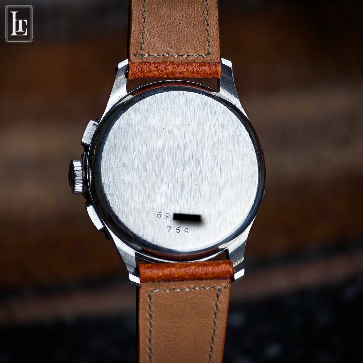 Questo esemplare, Ref. 769 , presenta un quadrante bianco pulito punteggiato da una grafica rossa nitida, una classica firma Breitling di metà anni '40 che aggiunge urgenza e contrasto senza eccessi. Il layout è disciplinato, la tipografia nitida e la presenza complessiva inconfondibilmente funzionale. All'interno batte il Venus 175, un movimento cronografico con ruota a colonne venerato per la sua affidabilità e fluidità di azionamento, recentemente revisionato e funzionante a dovere. Onesto, coerente e meccanicamente ordinato: esattamente ciò che un serio Chronomat vintage dovrebbe essere.