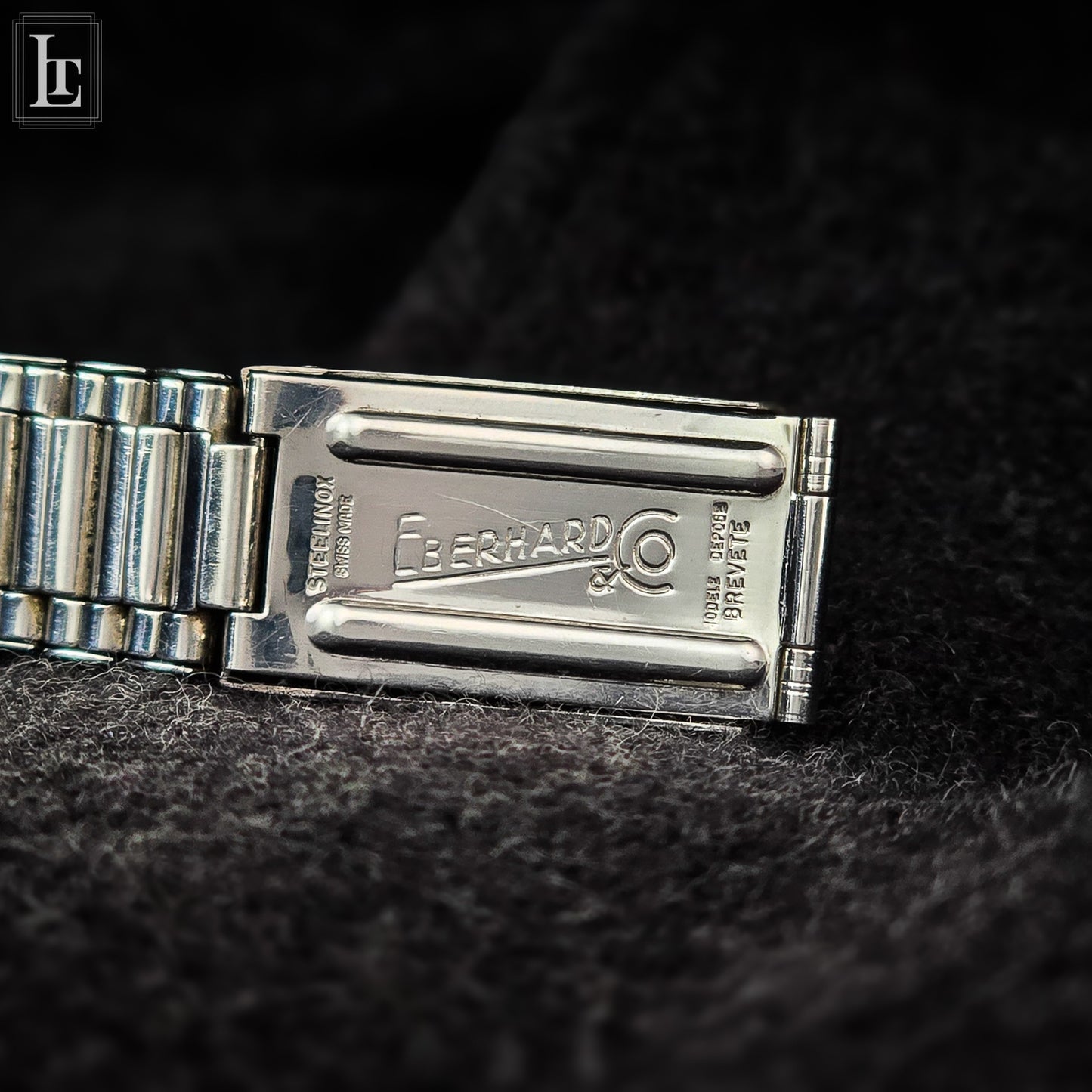 Lo Scafograf 300 del 1966 qui proposto è il perfetto connubio tra design unico e rilevanza storica. Il bellissimo quadrante nero, perfetto per l'occasione, presenta un datario alternato, semplicemente fantastico: i numeri delle date dispari sono neri e quelli delle date pari sono rossi. La luminescenza delle lancette, degli indici delle ore e dell'indice a 12 cifre sulla lunetta è uniformemente invecchiata, di colore giallo, e si illumina di verde alla luce. La ricercata lancetta dei secondi "rettangolare" è un altro dettaglio di grande impatto visivo di questo orologio. La cassa da 43 mm con anse a spirale è grezza. I bordi della cassa sono netti e definiti. La corona originale Eberhard è firmata con la "E" di Eberhard. La lunetta girevole bidirezionale è originale al 100% e in ottime condizioni. Sul fondello a vite è visibile l'incisione originale Eberhard con il cavalluccio marino. Lo Scafograf è alimentato dal movimento automatico calibro 266-123 .