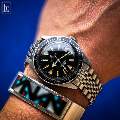 Questo subacqueo è in condizioni incredibili, completo del suo set originale, scatola, libretti e bracciale con maglie aggiuntive. Il quadrante nero lucido è impreziosito da indici al trizio; il movimento a carica manuale Felsa 96-4 è appena stato revisionato e funziona perfettamente.