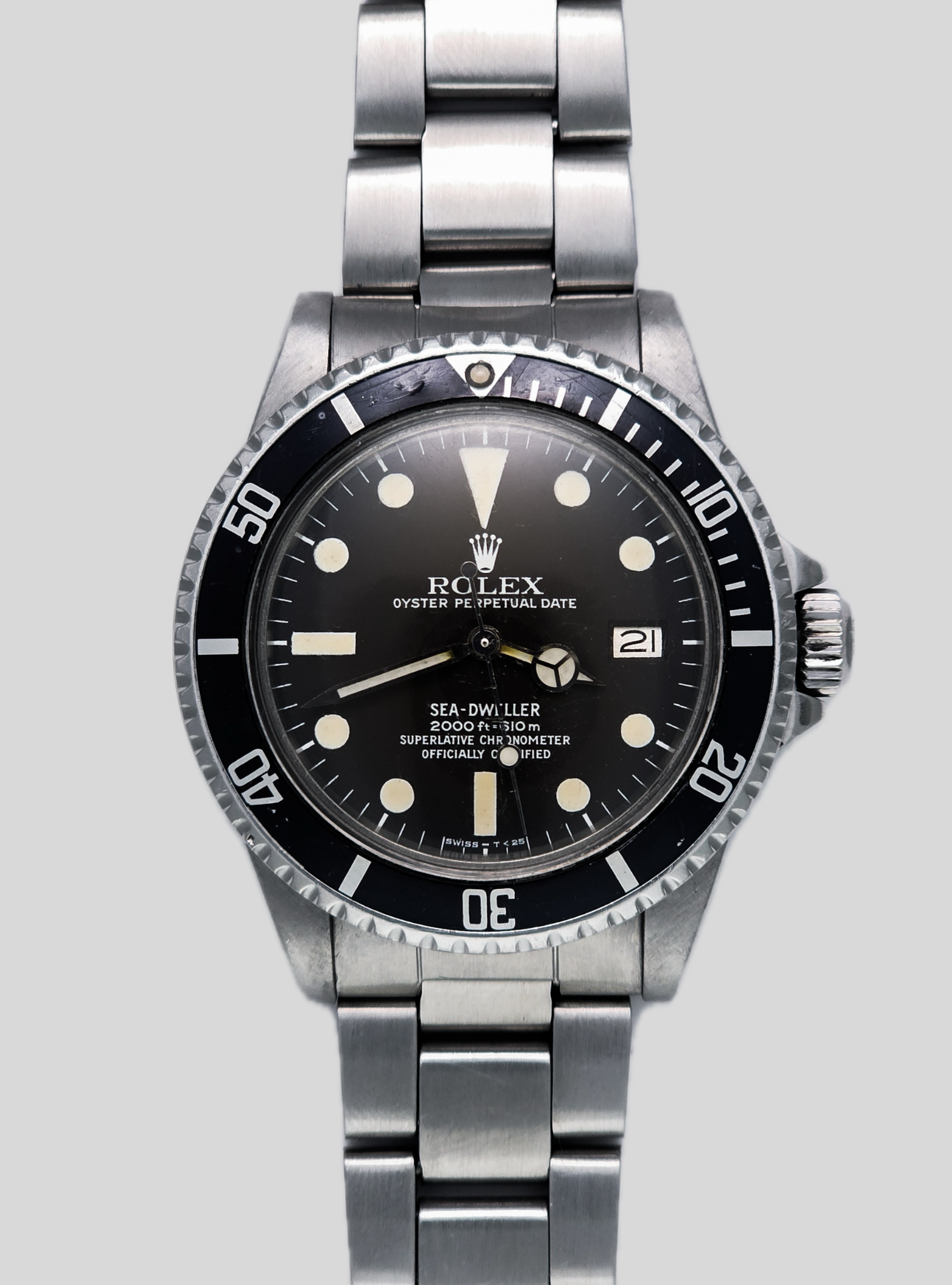 Dotato del corretto bracciale Oyster 93150 e di maglie finali 585 , questo Sea-Dweller conserva la sua autentica configurazione d'epoca. La cassa si presenta in condizioni eccellenti e autentiche, con anse robuste e smussi netti , a suggerire un'usura attenta e una lucidatura minima. L'inserto della lunetta presenta una leggera sbiaditura, che aggiunge profondità e carattere, mentre il vetro, con il suo caratteristico profilo bombato, ne esalta il fascino vintage. Insieme, questi dettagli raccontano la storia di un orologio-strumento ben conservato, invecchiato con eleganza, incarnando sia la competenza tecnica che l'estetica senza tempo che definiscono l'epoca d'oro degli strumenti subacquei professionali Rolex.