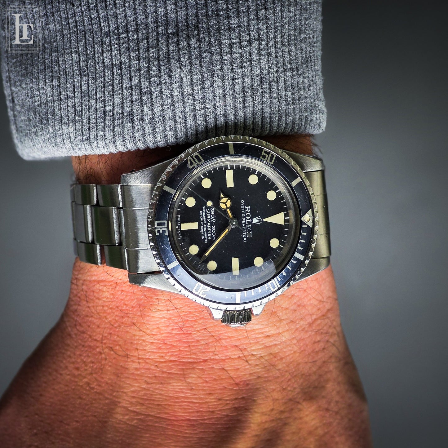 Rolex ha prodotto il 5512 fino al 1979, quindi l'esempio che abbiamo qui, del 1977, è degli ultimi anni di produzione. Durante questo periodo, Rolex realizzava il modello con quello che i collezionisti hanno soprannominato quadranti " Maxi ". Il termine "Maxi" si riferisce ai pallettoni di lume più grandi rispetto alle generazioni precedenti. È caratterizzato dai pallettoni lume più grandi, dalla profondità indicata in feet / metri sopra la scritta "Submariner" e dalla "S" piatta in cima in "Submariner": adoriamo questi piccoli dettagli!