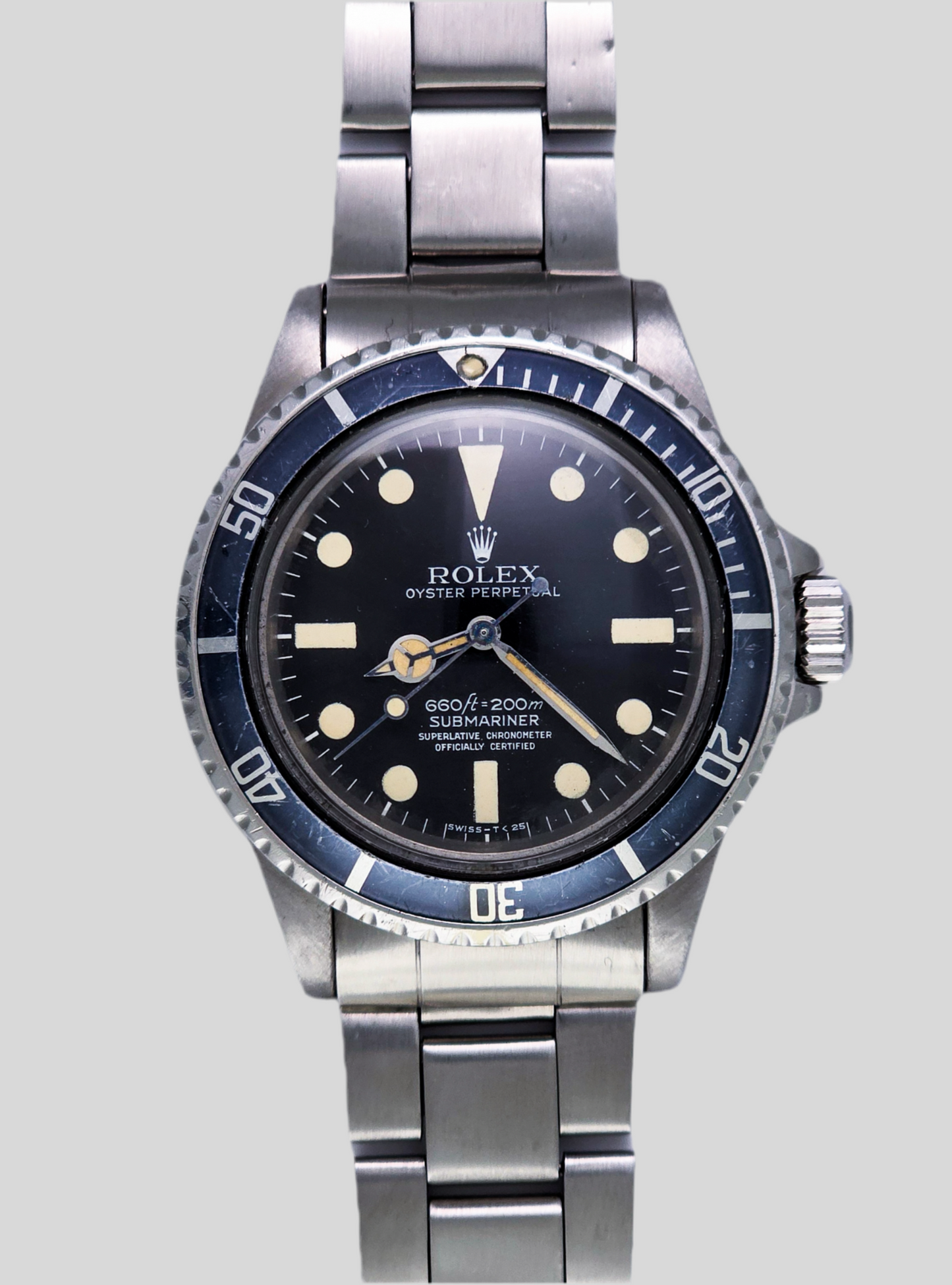 Questo Rolex Submariner è in ottime condizioni vintage. La cassa è in ottime condizioni, il quadrante è in condizioni eccellenti con patina grigio chiaro. Gli indici delle ore hanno sviluppato una patina e sono invecchiati fino a raggiungere un attraente colore sabbia.
