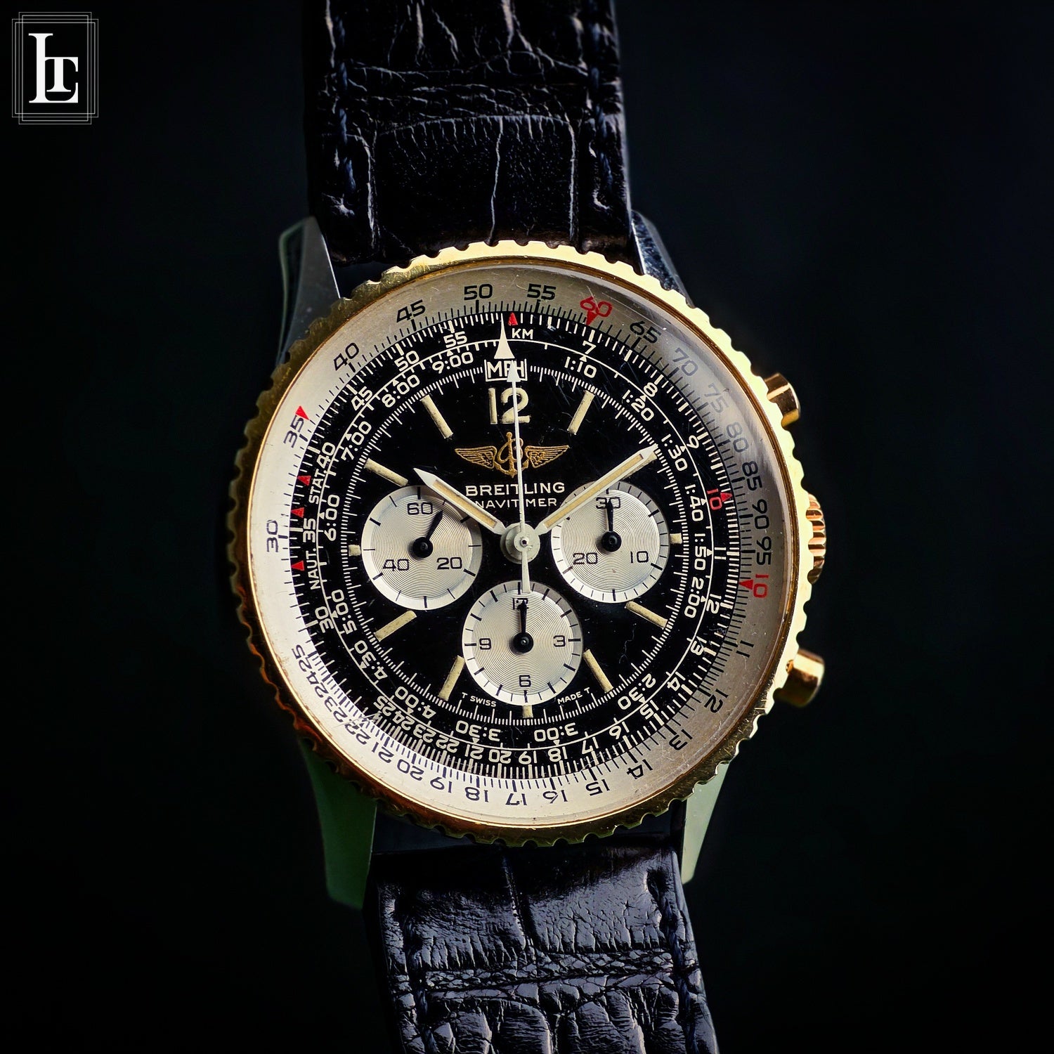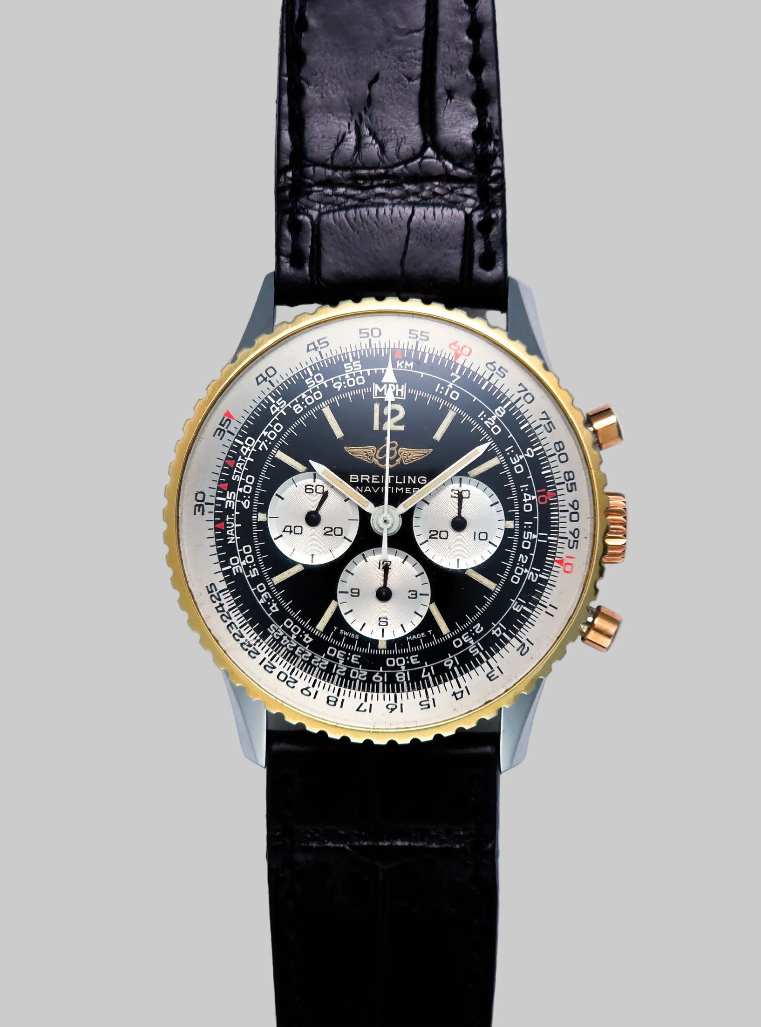 The heart of the watch is the hand-wound LWO 1873, recently serviced, delivering the crisp tactile feedback and mechanical purity that define traditional chronograph architecture. Every activation of the pushers feels deliberate, mechanical, authentic. The bidirectional slide rule bezel remains true to its original purpose: not decoration, but calculation. The black dial with white sub-registers preserves the unmistakable Navitimer identity — dense, technical, yet perfectly balanced.