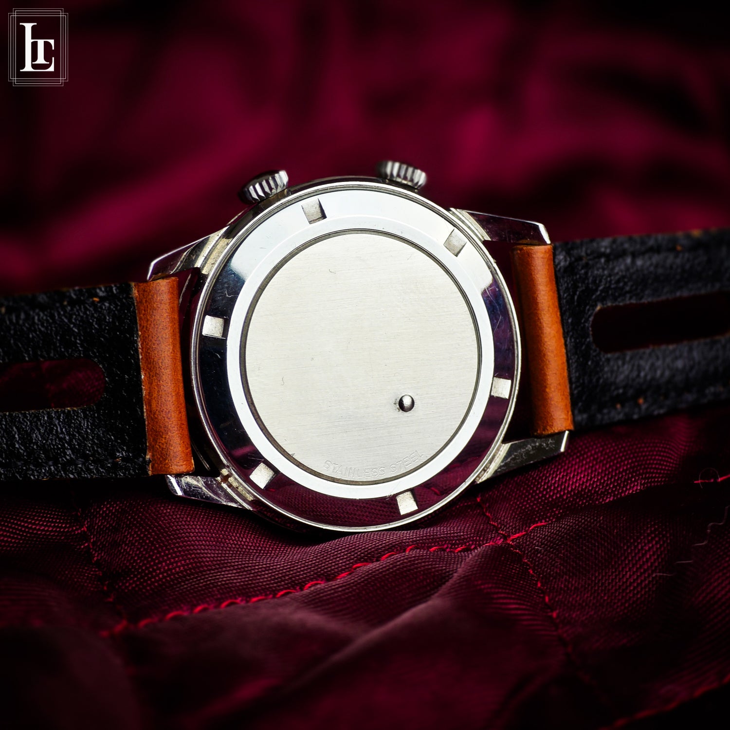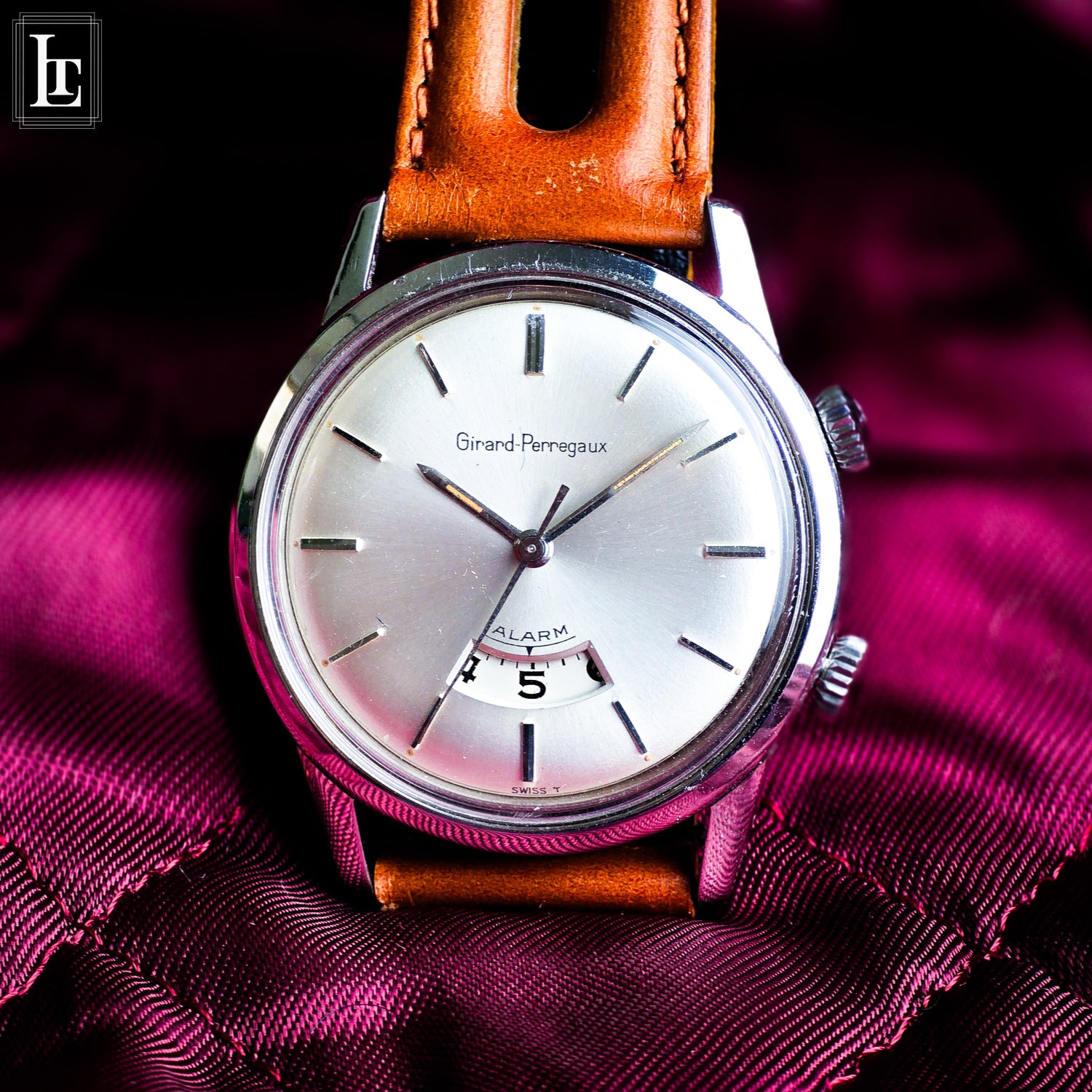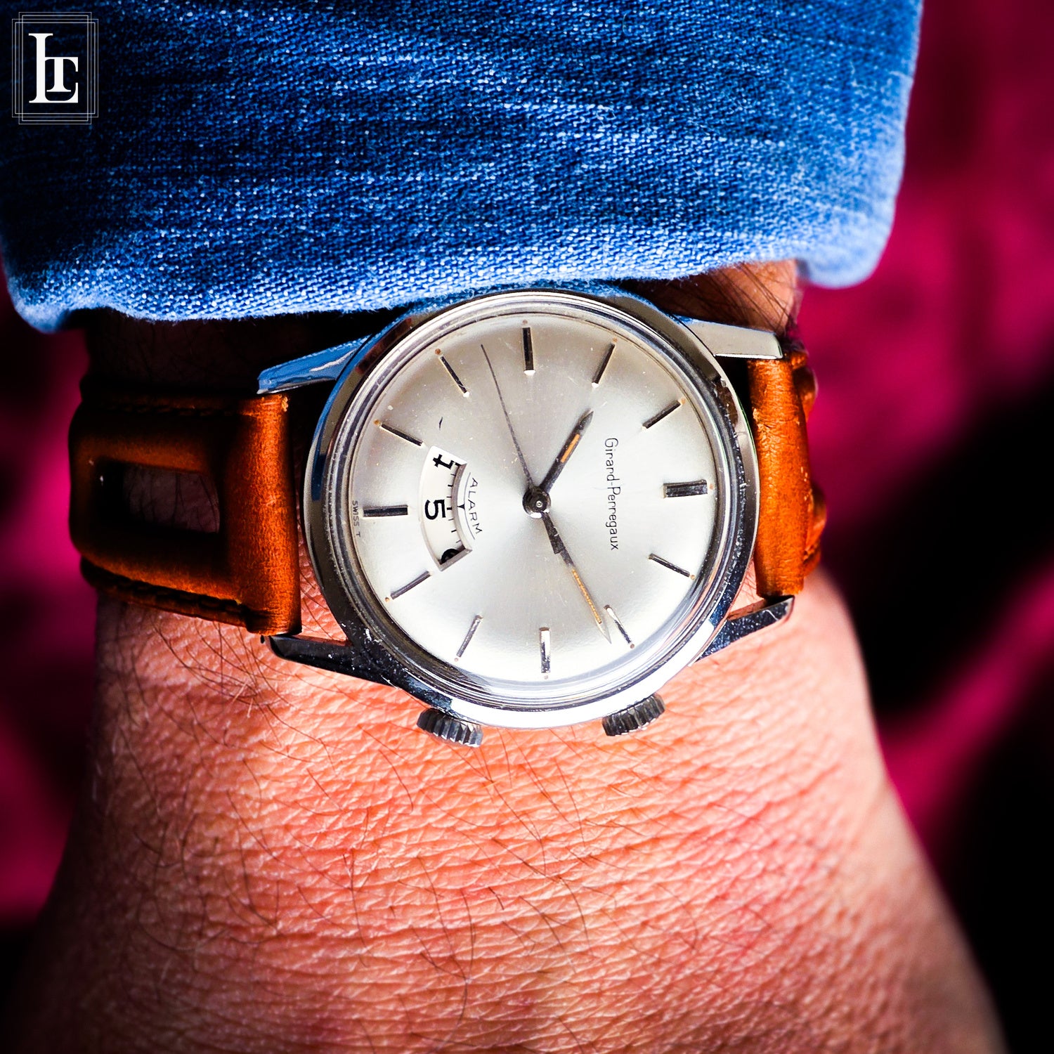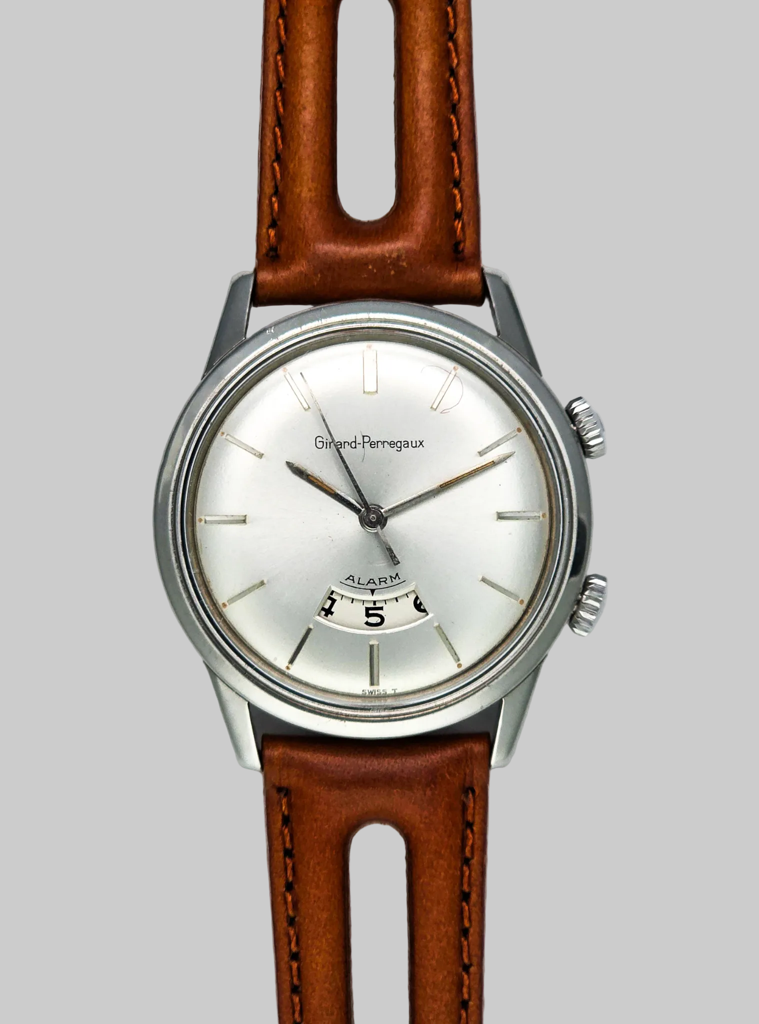 The stainless steel case measures approximately 35mm in diameter, a classic size for the period, well balanced on the wrist and faithful to the brand’s understated design language. The case lines are clean and sharp, with proportions that emphasize functionality over excess, while maintaining unmistakable Girard-Perregaux elegance. The white dial is sober and highly legible, featuring clear applied markers and a discreet alarm indication, all preserved in a coherent vintage aesthetic. The overall look is crisp, timeless, and unmistakably 1960s.