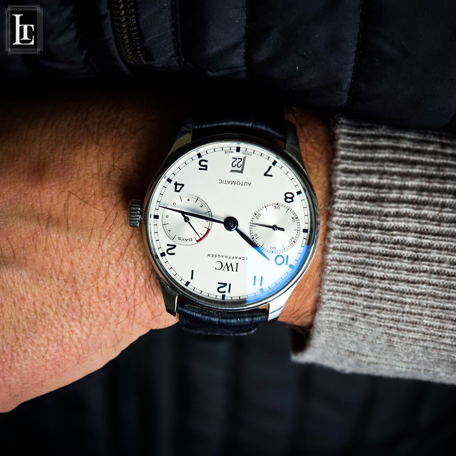 On the wrist, the watch wears with quiet authority. The polished steel case has presence without shouting, while the blue alligator strap with deployant clasp keeps the overall look formal, composed, and unmistakably Portoghese. This is a watch for someone who understands proportion and doesn’t need complexity to justify value.