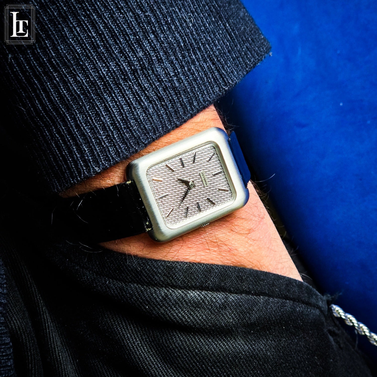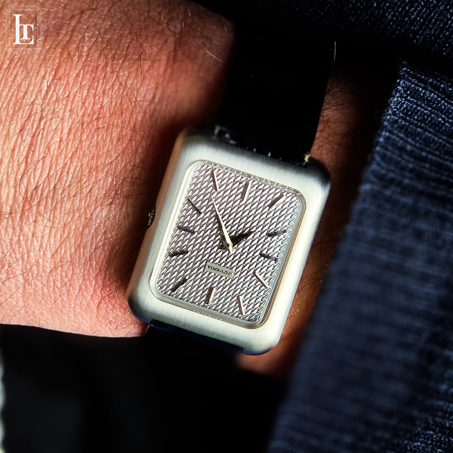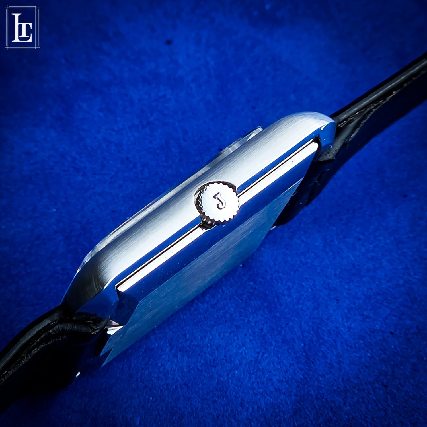The rectangular steel case is the first statement. Compact, geometric, unapologetically mid-century in spirit, it wears with a quiet confidence that modern reinterpretations often fail to capture. Proportions are elegant and restrained, designed for a wrist that appreciates nuance rather than presence.