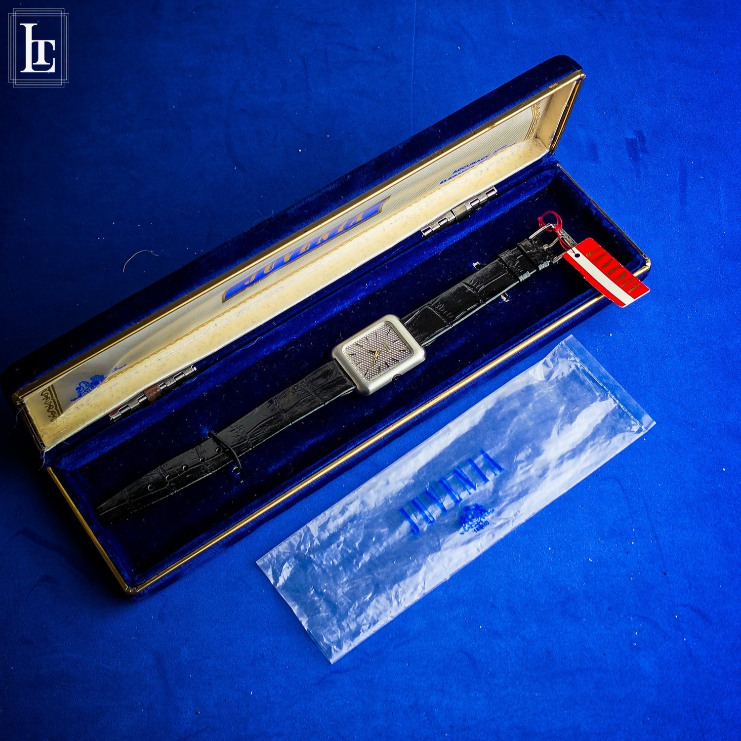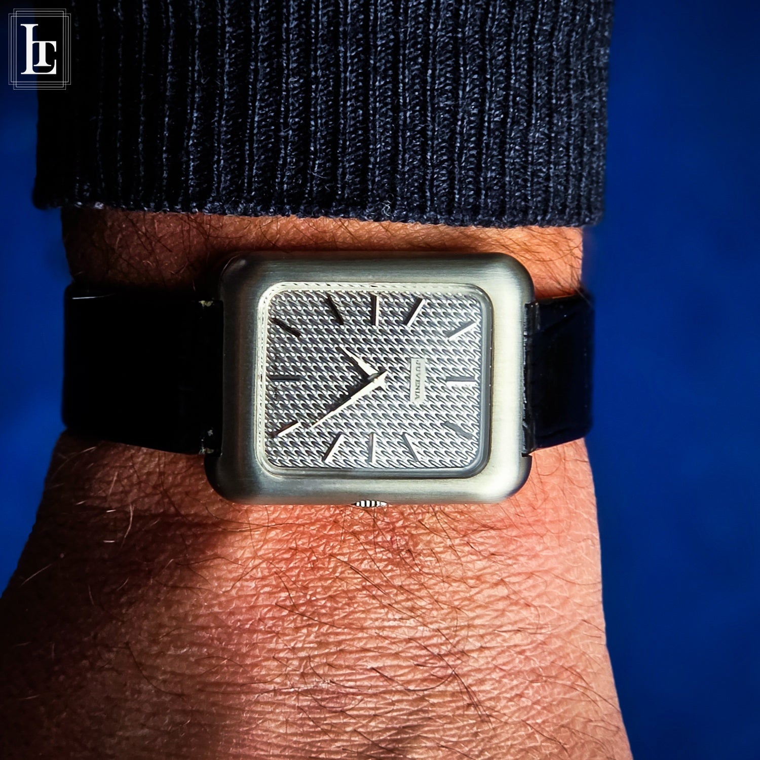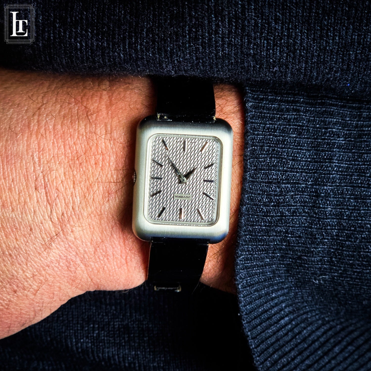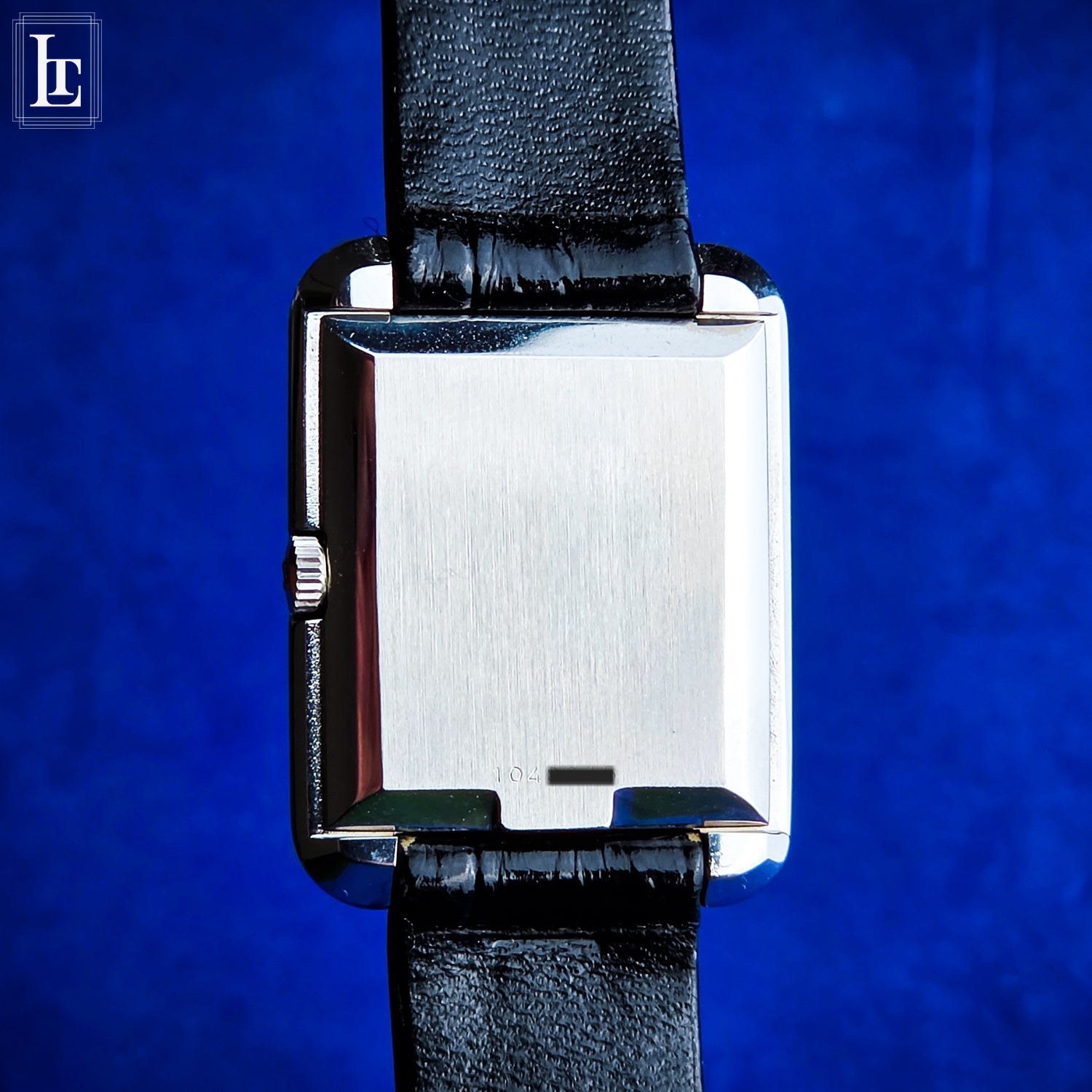 The rectangular steel case is the first statement. Compact, geometric, unapologetically mid-century in spirit, it wears with a quiet confidence that modern reinterpretations often fail to capture. Proportions are elegant and restrained, designed for a wrist that appreciates nuance rather than presence.