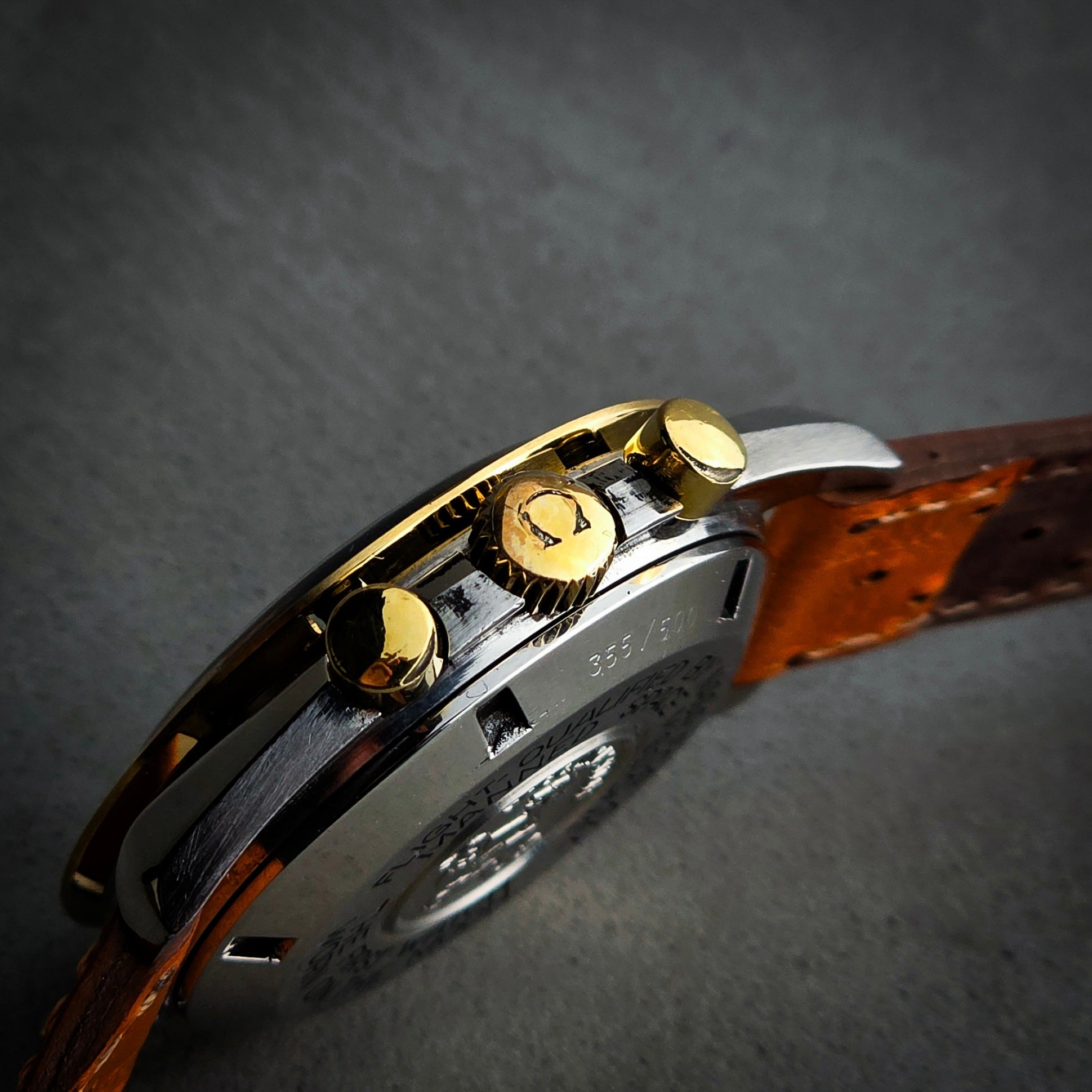Fitted on a racing honey cowhide strap with original buckle, the watch balances sport character and collectible appeal. This is not simply a variation: it is a numbered, market-specific execution that reflects a precise moment in Omega’s history and in the Italian collector scene.