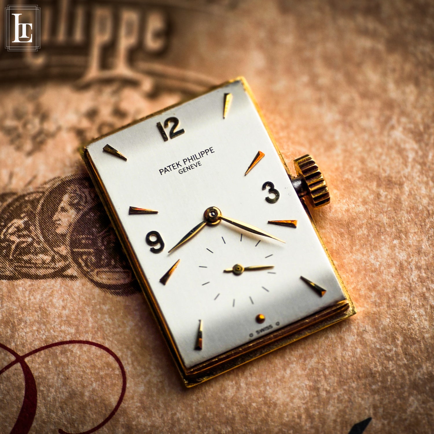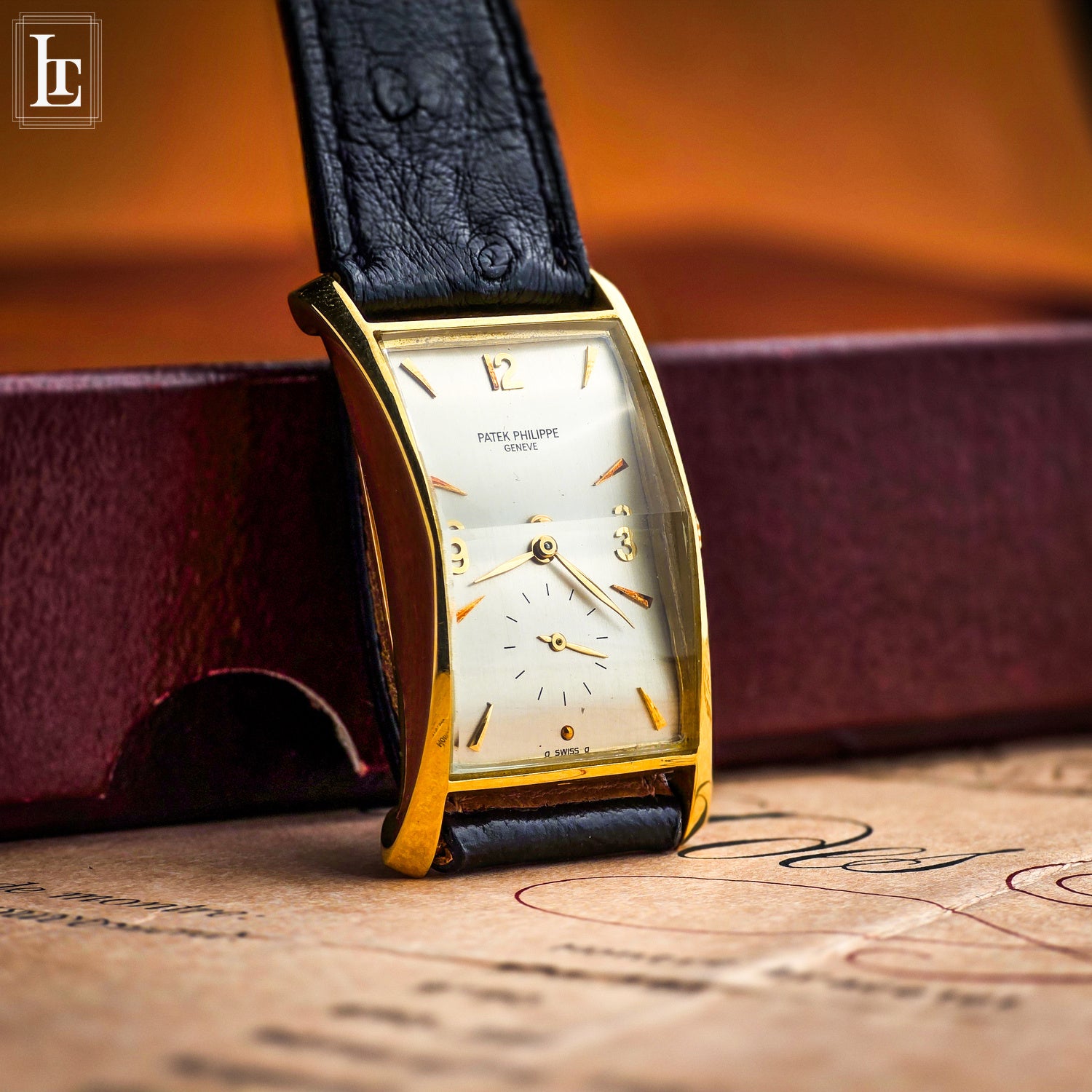 Powering the watch is the celebrated caliber 9'''90, a hand-wound movement specifically designed to follow the tonneau architecture of the case. Renowned for its robustness and refined finishing, it features Geneva stripes, a compensation balance, and micrometric regulation and it has just been fully serviced. The silvered dial is animated by applied yellow-gold Arabic numerals, faceted triangular and dot markers, subsidiary seconds, and leaf-shaped gold hands—an ensemble that perfectly balances geometry and classic Patek restraint.