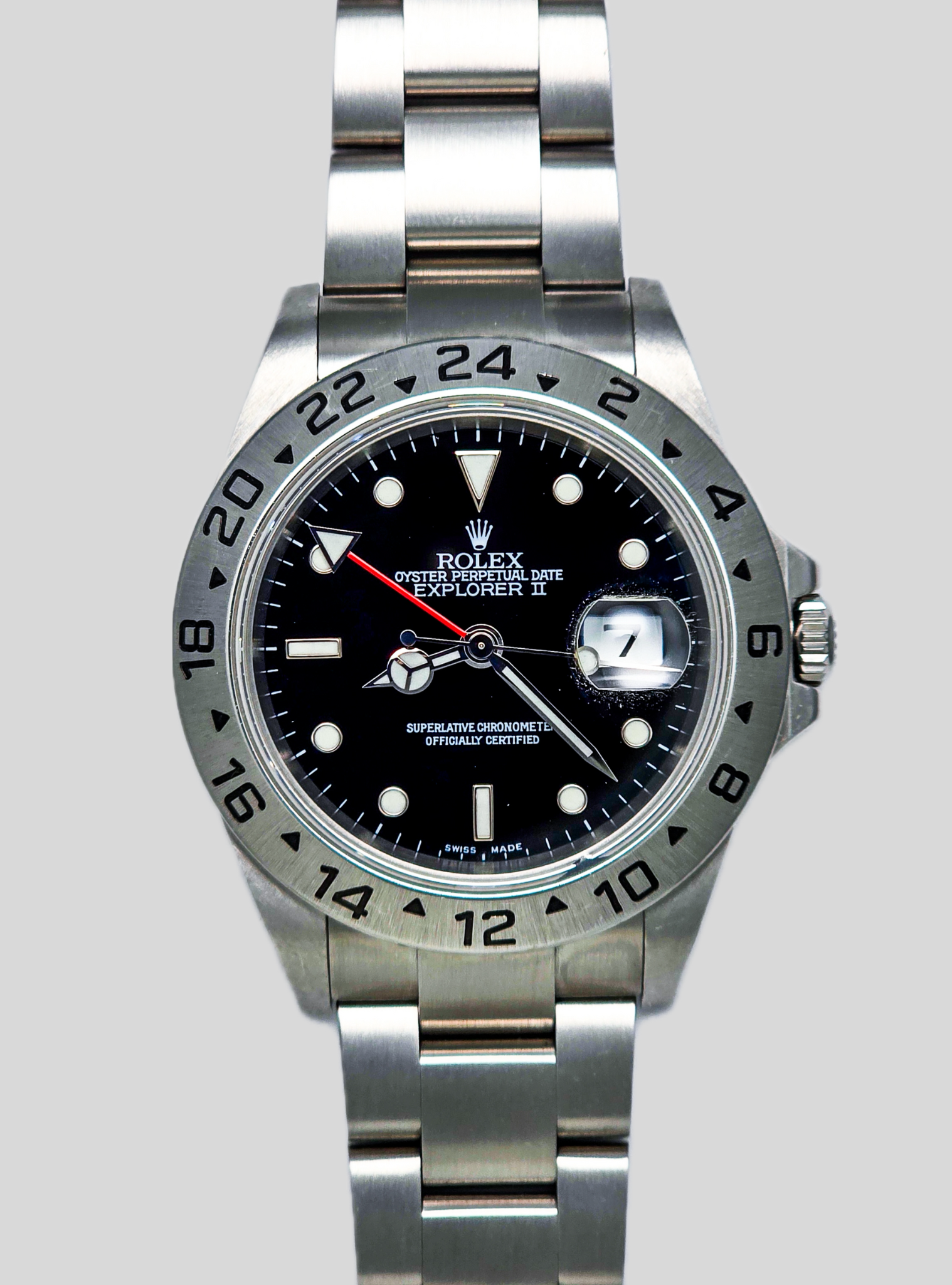 The reference 16570 represents the Explorer II at its most balanced and mature stage. Produced from the late 1980s until 2011, it retained the classic 40 mm proportions while benefiting from modern technical upgrades, most notably the calibre 3185. The black dial configuration is the most understated and functional expression of the model: high contrast, perfect legibility, zero excess. The orange GMT hand provides immediate visual orientation without compromising the tool-watch character.