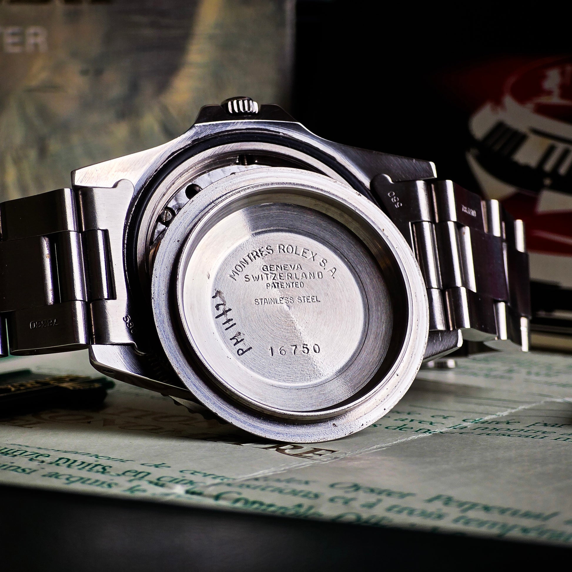 Introduced in the mid-1950s, the Rolex GMT-Master was originally developed in collaboration with Pan Am Airways to aid pilots in tracking multiple time zones during the golden age of intercontinental travel. The reference 16750, launched in the late 1970s, represented a major technical evolution — introducing the quickset date and an upgraded Caliber 3075 , while preserving the classic aesthetics of the original tool watch.
