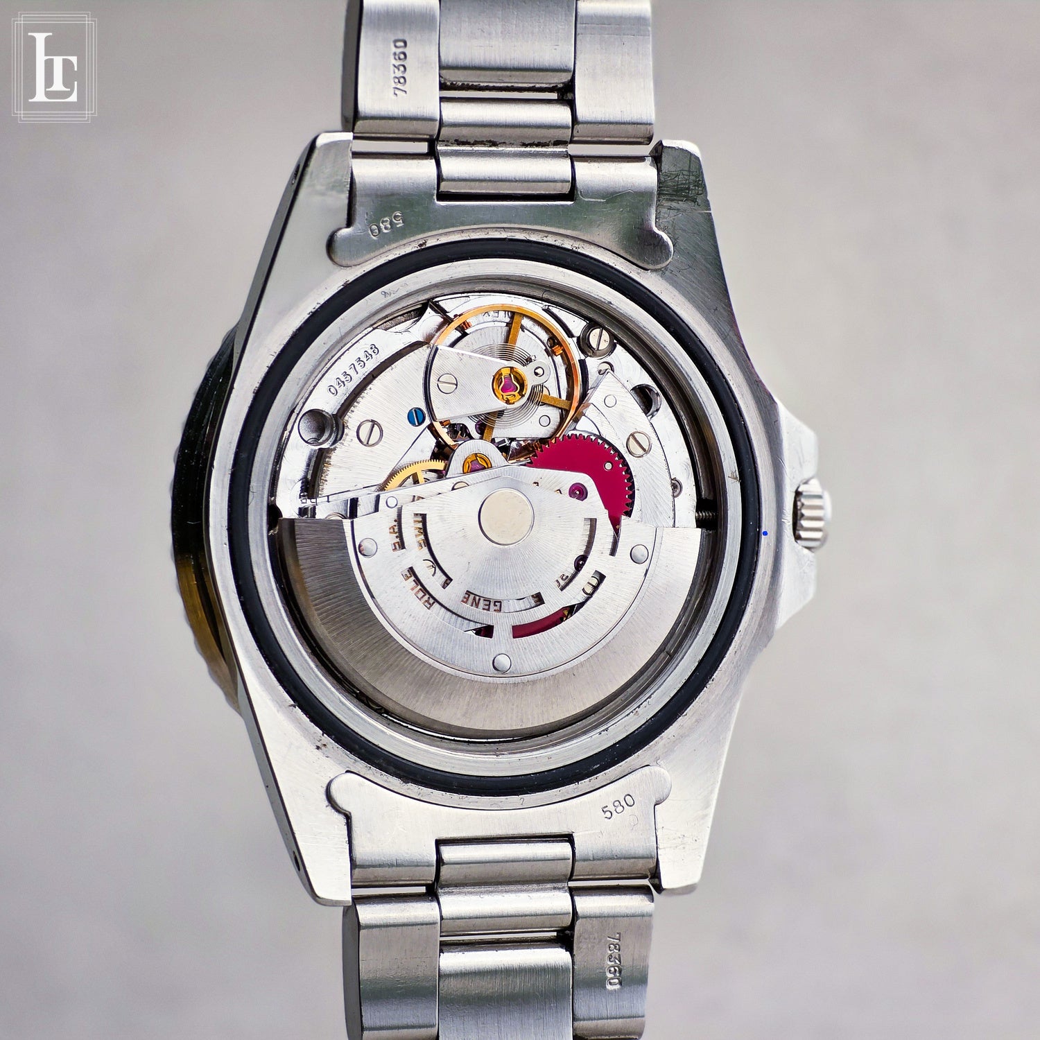 Equally impressive is the Pepsi bezel insert, whose colors remain remarkably vivid. The red and blue tones retain strong saturation without drifting into dullness, a clear indicator of careful use and long-term preservation. The overall aesthetic balance between dial, lume, and bezel is exactly what seasoned GMT collectors look for. The bracelet is a period correct Rolex Oyster Ref. 78360 VE/580.
