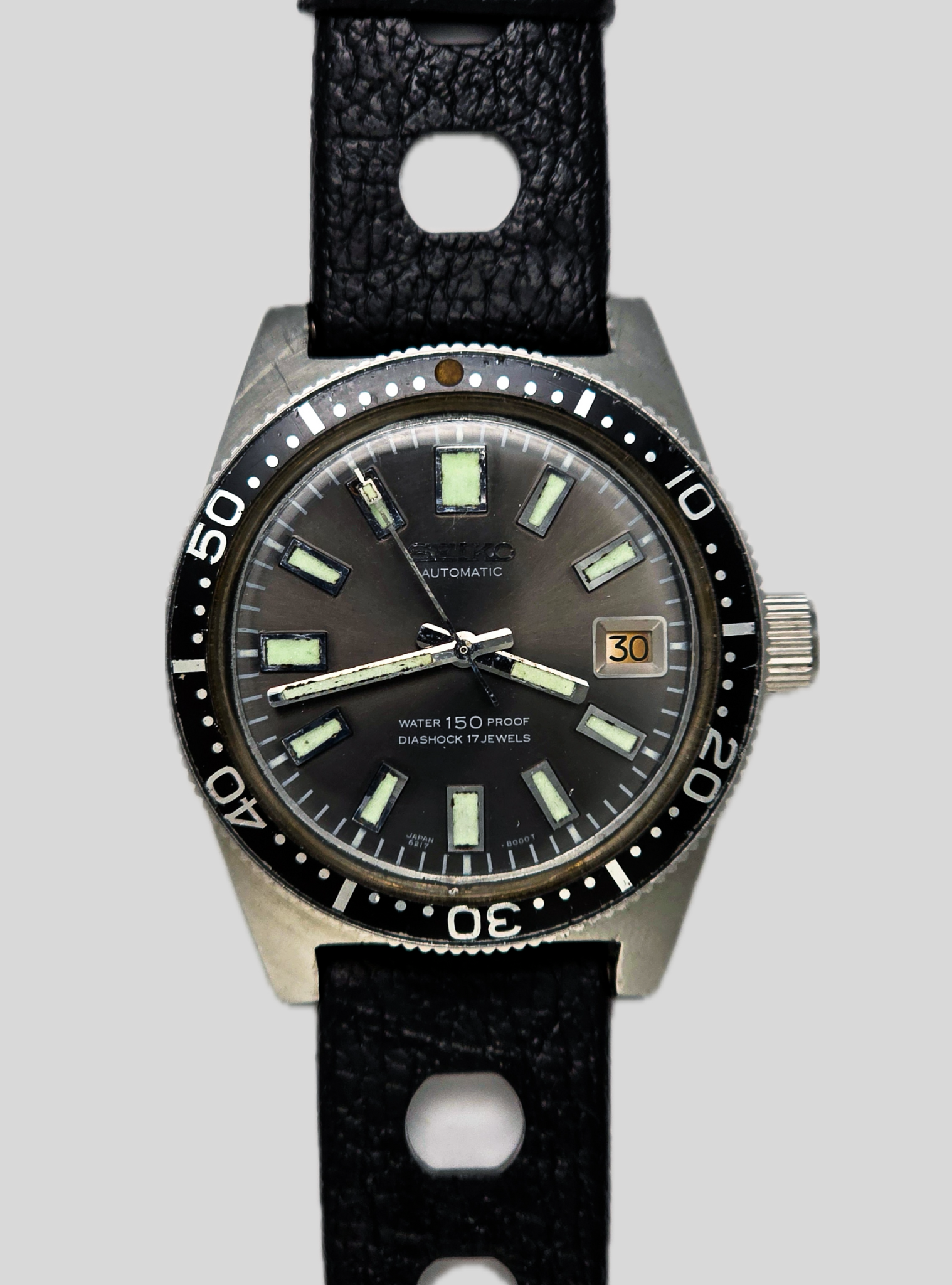 The 62MAS has since become a legendary model among collectors, appreciated not only as Seiko’s very first diver but also for its timeless proportions and understated elegance. The grey sunburst dial, tritium lume that has aged to a warm patina, and the utilitarian 37 mm case size give this piece both vintage charm and historical importance. Produced in 1967, this example has been fully serviced, maintaining the authenticity and integrity of its design. More than just a watch, it represents the beginning of Seiko’s journey into the world of professional diving instruments — a journey that would ultimately produce some of the most respected and sought-after tool watches in history.