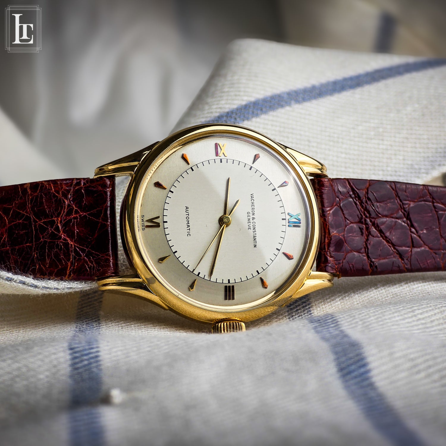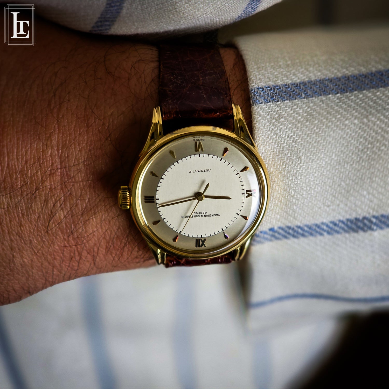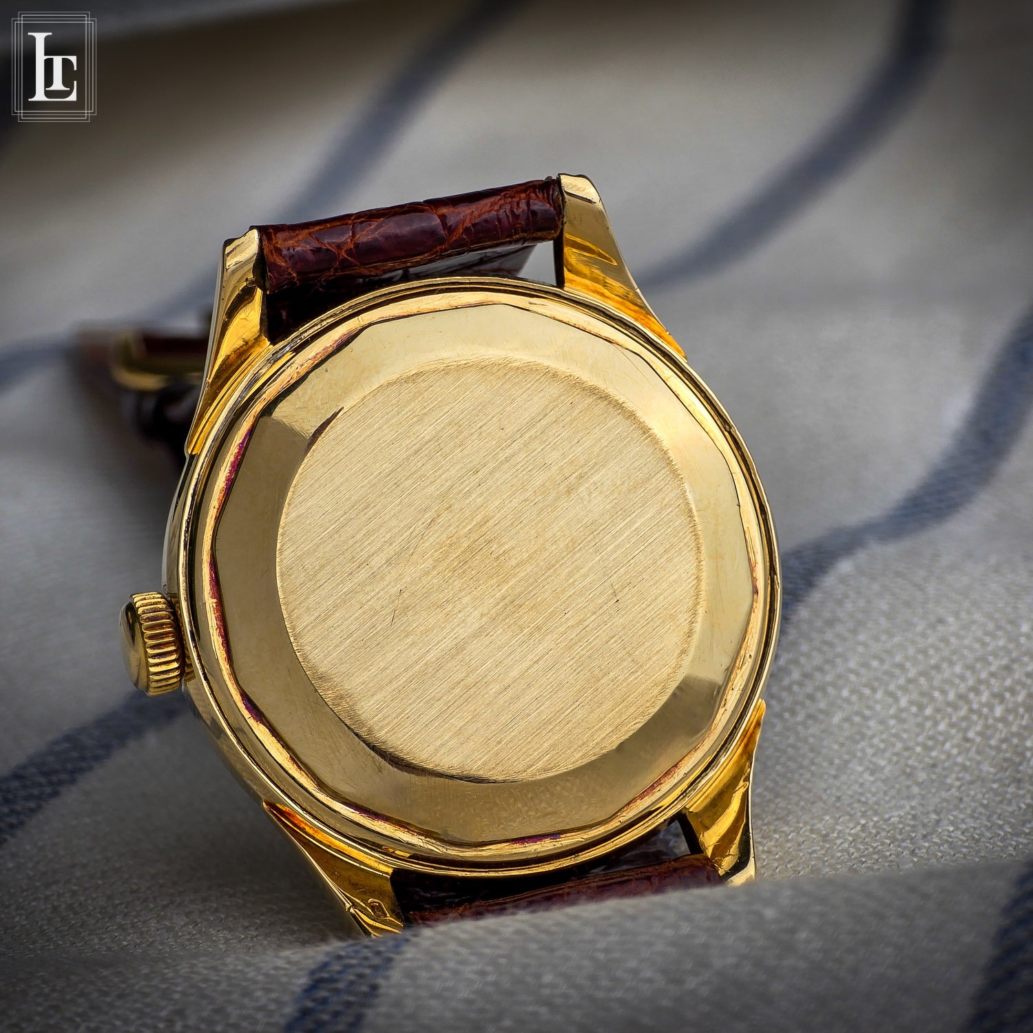 A remarkable example of mid-century Swiss watchmaking, this Vacheron & Constantin Genève Automatic embodies the understated elegance and technical refinement that define the maison’s golden era. Crafted in 18kt yellow gold, the 35mm case features fancy sculpted lugs and a screw-down caseback (SN 3xxxx) housing the renowned calibre 477/1 bumper automatic movement, a hallmark of Vacheron’s post-war innovation. The watch presents a beautifully aged Indelible two-tone silver dial with applied gold Roman numerals and arrow markers, showing a warm patina that adds depth and authenticity.