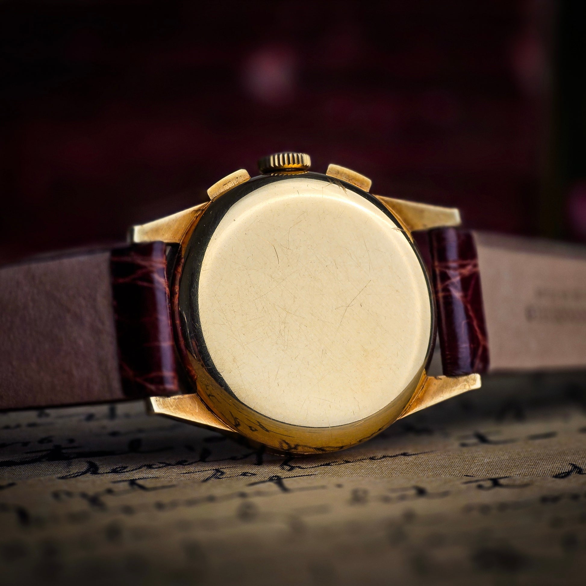 This stunning Zenith Compur Ref. 12412 embodies the golden era of the brand’s craftsmanship. Housed in a 35 mm solid 18k gold case, it preserves an elegant yet robust presence, defined by sharp edges and well-proportioned lugs that reflect its untouched geometry. The sandwich dial, an exceptionally rare feature for its time, presents a multi-level construction that enhances depth and legibility. Its warm patina and refined printing highlight the meticulous detail Zenith applied to every component.